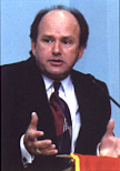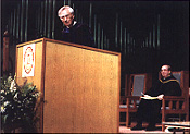 Dr. Dockery looks on as Dr. Millard Erickson lectures during the Inaguural Chapel and Academic Lecture. Dr. Dockery has recently edited New Dimensions in Evenagelical Theology, a collection of writings in honor of Erickson. |