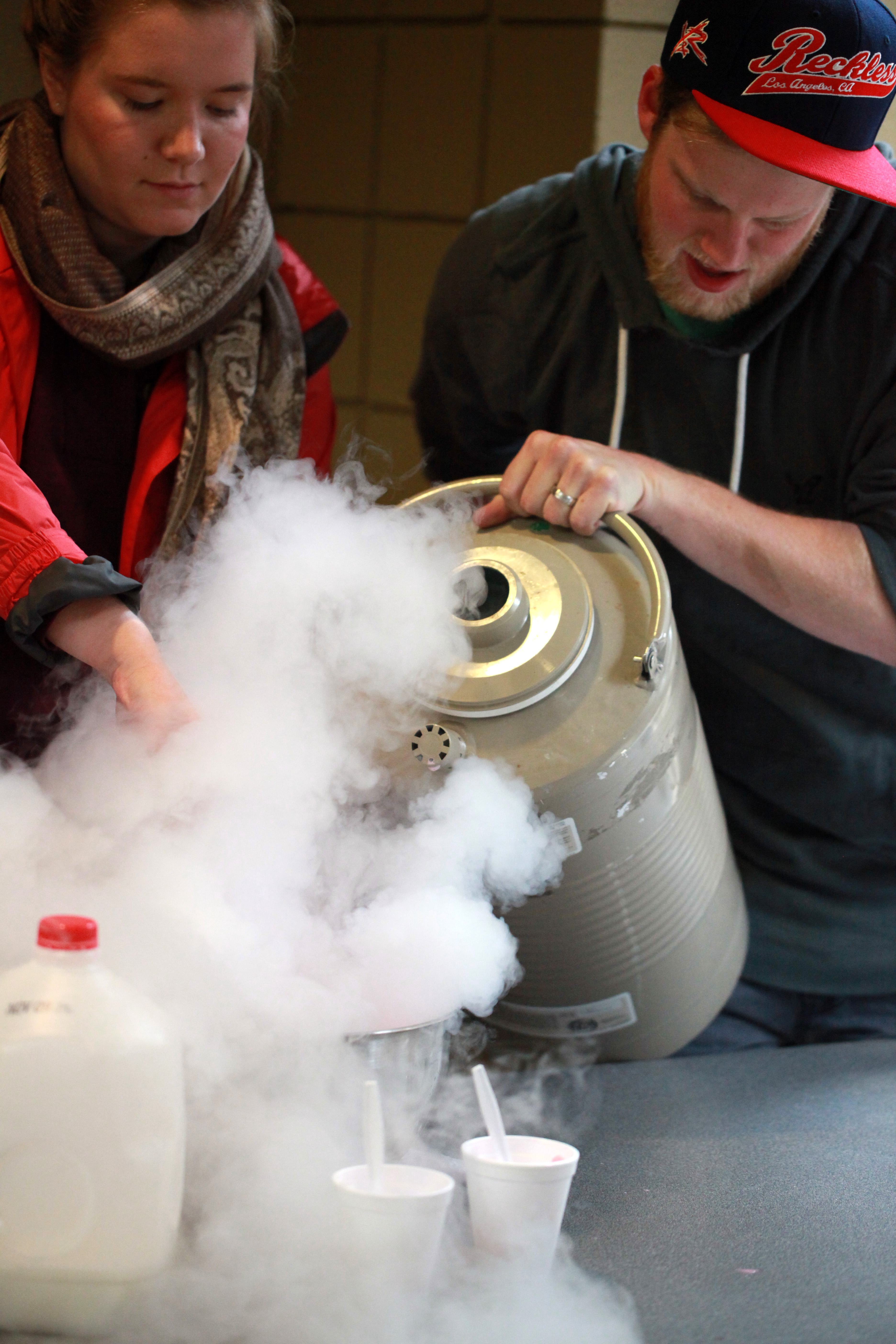 10/26/12 - 21331 Chemistry students pour liquid nitrogen to make ice cream for fellow students during National Chemistry Week. - Kristi McMurry