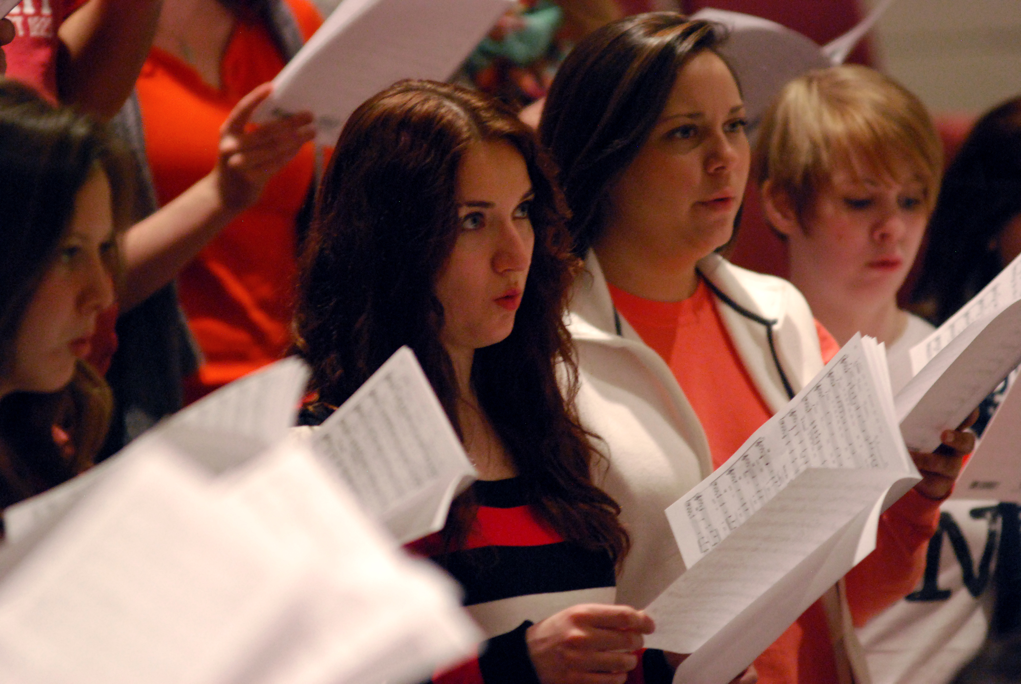 2/26/13 - 21505 Kelsey McFarland, junior music and psychology double major, and Mollie Greenlee, senior music major, practice with University Singers in Hartley Recital Hall. - Anne Richoux