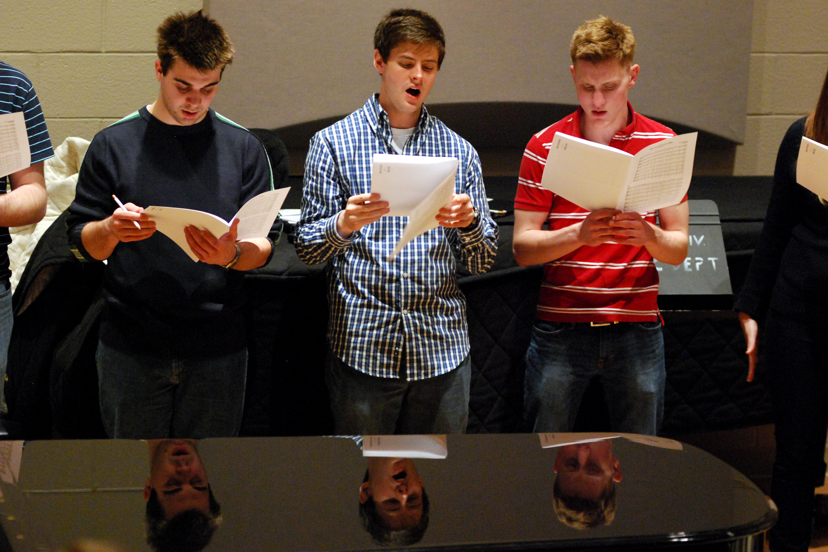 2/26/13 - 21507 University Singers Kenan Keller, sophomore history major, Jeremy Isbell, senior music major, and Will Burke, junior music theory major, practice in Hartley Recital Hall. - Anne Richoux