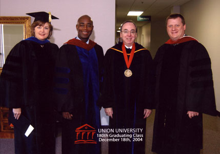 | Dec. 2004 - Union's Fall Commencement | May 2005 - Union's Spring Commencement | May 2005 -Union's Spring Commencement | Dec. 2005 - Union's Fall Commencement | August 2006 - Union's Summer Commencement | September 2006 - President Dockery and Winston Churchill approach the administrative offices on Union's campus. | September 2006 - Winston Churchill greets Union students as he arrives on campus. | September 2006 - Winston S. Churchill and David S. Dockery pose for a photo before the Tenth Annual Scholarship Banquet. | October 2006 - President Dockery poses with Senator Lamar Alexander. |