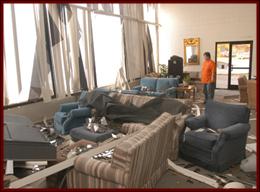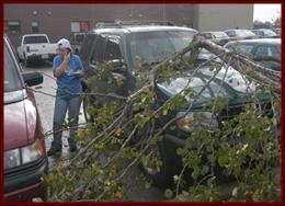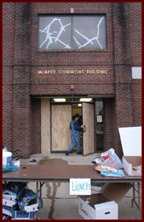 Early Sunday morning, Nov. 10, 2002, time stood still at Union University. That’s when, according to student eyewitness accounts and the National Weather Service, an F1 tornado formed above the campus, creating 110-mile-an-hour winds which blew dumpsters and picnic tables through the air, knocked down trees and power lines, and broke and shattered glass windows in cars and buildings. The time on the clock of the university’s Miller Tower read 12:05. It would stay that way for the next 18 hours. |