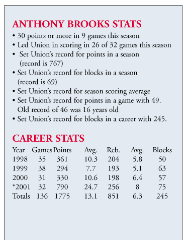 ![]() Anthony Brooks, a senior communication arts major, enjoys talking about sports off the court almost as much as he does playing on the court.