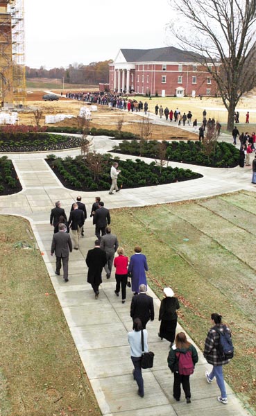 Building for the Future The Lifeway Christian Bookstore has been a great addition for the campus and community. It seeks to combine all the services of a campus bookstore with the resources of a nationally recognized store. Union’s partnership with Lifeway is unique and has been a work in progress. However, the store has been a great asset to the campus in many ways, explains President David S. Dockery. As Hammons Hall drew to completion, a buzz of activity began across campus. The West Campus was taking shape with the development of Jennings Hall, Miller Tower, and the Great Lawn. Over two years into the process, the change is breath-taking. The 120-foot brick clock tower will anchor the new Great Lawn. The area will be a central gathering place for students and serve as a beautiful backdrop for special events such as graduation. The stunning tower and beautiful landscape shares the West Campus with an equally impressive Jennings Hall. “Jennings Hall will meet pressing needs for our growing campus, providing state-of-the-art facilities for our music and communication arts departments and much needed space for Union's nationally acclaimed Christian Studies Department,” said Dockery. “We thank God for His continued blessings to this university.” Jennings Hall, which was officially dedicated in December 2000, provided a state of the art facility for the departments of music, communication arts, and Christian studies. The 45,000 square foot building was the first academic building to be constructed on Union’s campus in 15 years. That is what the vision for the Campus Master Plan is about – building for the future. But the task has not been easy. A great amount of time has gone into clearing and grading the land, setting up drainage systems, installing sidewalks, irrigation, and lighting, and landscaping.