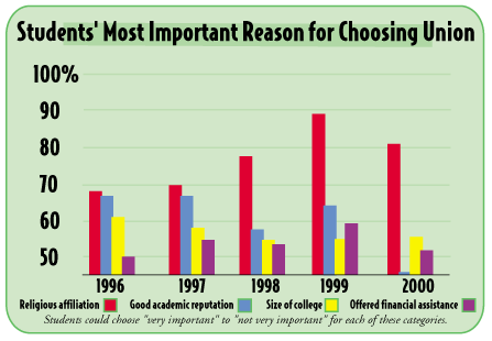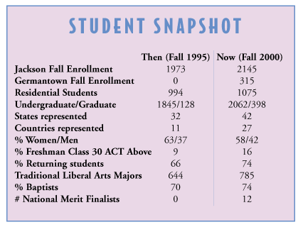 being at Union or any other institution.” “For the first time in 20 years since I’ve been here, we’ve reached this dream of mine to be a ‘real’ Christian university and ‘real’ academic university, together as one,” says Carrol Griffin, assistant vice president for enrollment management and director of admissions and retention. “Since Dr. Dockery came and started talking the talk – we’re now taking these Christ-like principles and imparting them to students in a practical way, that they can use in their daily life.” “With this heightened emphasis on integration of life, students are able to learn how to combine their academic abilities with a profound commitment to Jesus Christ,” agrees Guthrie. “Life isn’t fragmented into different pieces, with your spiritual life here, your social life over here, and your academic life over there. You’re a whole person with many different parts that have to work together. That’s why integration of faith and learning has to be the driving force behind everything we do.” Guthrie says it’s that philosophy that has attracted students far and wide to Union University’s campus. In 1995, the Jackson campus enrollment was 1,973. Today it has grown to almost 2200 (as of fall 2000) with an additional 315 graduate and professional students studying at the Germantown campus. Geographically, the university continues to increase its diversity with 42 states and 27 countries now represented as opposed to 32 and 11, respectively, in 1995. The quality of students has also improved: 16 percent of the freshman class of 2000 had a 30 ACT or above, an increase of more than 7 percentage points from 1995. A dozen National Merit Finalists now call Union home; five years ago, there were none.