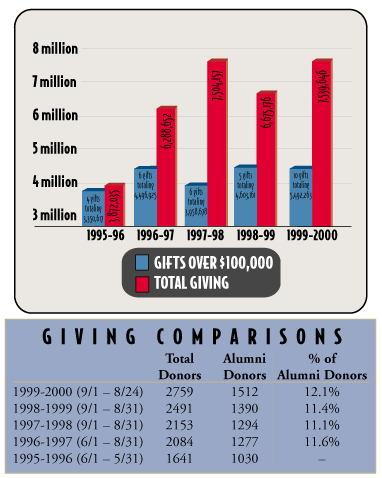 “Union receives generous annual gifts from several sources, including foundations, businesses, churches, and the Tennessee Baptist Convention,” explains Bob Alsobrook, vice president of institutional advancement. He points out that giving from individuals, including alumni, trustees, faculty and staff, friends and parents of students totaled more than $3.1 million in 2000 as compared to slightly more than $800,000 received in 1995. “There’s definitely a momentum of increased gift support from individuals achieved during the past five years. What’s also exciting is that each year more and more alumni and friends are joining in the vision of building a future for Union by making gifts to the University.” Overall, the amount of total giving to the university for the past five years has sharply increased – from less than $4 million in 1995 to more than $7.5 million in 2000, with the number of donors growing from a little over 1500 to almost 2800 annually. The number of gifts of $100,000 or more has also steadily risen, from only four in 1995 to ten this past year. “Our alumni are potentially our biggest support group,” says Grisham, “and it’s been great to see that increase in level of participation from our alumni. I hope we can see more.”