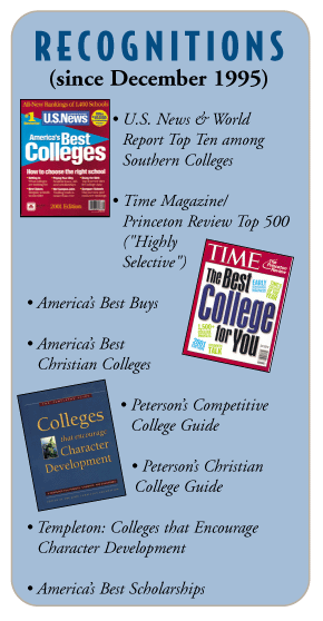 “I’m deeply impressed with what Union is doing in promoting a biblical worldview – an understanding of all of life under the Lordship of Christ,” says Chuck Colson, founder of Prison Fellowship Ministries. “I have watched over the last several years as Union has achieved a pre-eminent place in education in America. It’s doing things that universities classically did but no longer do – bringing faith from a Christian perspective, and integrating it with learning. That’s a cliché many people use, but Union is really doing it, right across disciplinary lines, showing how Christian truth is at the root of all knowledge and all learning. I think it is one of the outstanding universities in America today.” Ministry opportunities for students have also grown with the restructuring of programs like chapel services, which have seen attendance more than double in size over the last five years, as well as the addition of new programs such as LIFE Groups – a ministry started for incoming freshmen with a voluntary participation of 90% of the entering class remaining the norm. Even mission trip participation has increased, with an average of 200 students participating each spring in GO Trips as compared to less than 100 in 1995. “The vision of campus ministries has really changed since I came here as a freshman,” says Jeanna Young, a senior psychology major from Blytheville, Ark. “We are really encouraged to look past the campus for ministry opportunities, and the whole structure is no longer oriented just toward the student body as a whole, but individual discipleship is being utilized as well, which I’ve really enjoyed.”