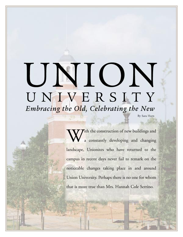 “It’s almost an understatement to say that we’ve come a long way in a short amount of time,” says George Guthrie, department chair of Christian studies and Benjamin W. Perry Associate Professor of Bible. “It’s very evident to me, though, just from looking back six or seven years ago. At national professional meetings, people would ask where Union was located. Now people are saying ‘Union – there’s a university where a lot of things are happening.’” With the addition of ten new majors, six centers for academic leadership and development, and more than 20 renovations and new buildings being completed, one can’t help but catch the excitement and the momentum that has hit the campus. “There seems to be an overall spirit pervading the campus that important work is being done here,” says Joseph Blass, university professor of music, who currently holds the title as the longest reigning faculty member at Union (he joined the university in 1959). “There’s a spirit of being excited about the future – a spirit that Union is becoming an institution of great significance, not just in Madison County and West Tennessee, but comparable to more significant schools outside our area.” Gary Grisham, ’75, president of Union Planters Bank in Jackson, who just completed a term as president of Union’s Alumni Association, says expectation is the crucial factor for the sudden growth and success of the university. “The new administration raised everyone’s expectations – the university’s purpose, its reputation – everyone has simply expected more. Union is at its current status because the administration said this is how good we want to be, how good we expect to be, and how good we actually are,” says Grisham.