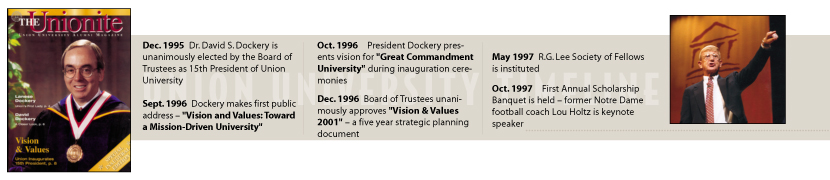 Vision & Values 2005 – Building a Future As Union continues to develop a grace-filled community of learning on campus, current students and returning graduates have much to look forward to for their university. A new Science Complex and an Athletic/Convocation Center will soon join the expanding and growing campus surroundings, along with renovations planned for current buildings, including an expansion of the library. New academic programs (such as digital media studies, engineering, and international business) and the addition of new graduate programs in nursing, education and intercutural studies will continue to help Union students advance in their chosen fields. “It’s a special time to be at Union,” says Baldwin. “When I first came to Union, I believed that the best days were ahead, and I still think that’s true – we are literally laying a foundation for things to come.” “For me personally, I’m excited to see where we’ve come and where we are going as a university,” says Taylor. “As trustees, we’ve really tried to honor God’s direction for this institution with making good, prudent decisions. As a result, I think He has provided us with some very positive results. “We don’t lose sight of the fact that there is a divine appointment that has taken place on this campus. I see it as an enormous responsibility that we have – to make sure we recognize that our strength lies in our trusting and dependence upon God’s direction of us as individuals and together as Union University.” |