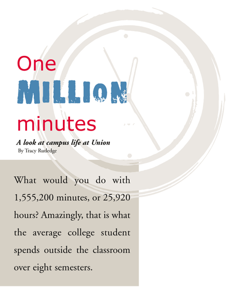 What would you do with 1,555,200 minutes, or 25,920 hours? Amazingly, that is what the average college student spends outside the classroom over eight semesters. Considering the enormous amount of time students spend outside the classroom, it’s no wonder Union has such a strong commitment to student development. And, over the past five years, that commitment has grown stronger. When freshmen come to Union, most expect to receive a top-rate education. However, student life research shows that education extends beyond the classroom. Students spend as much as 90 percent of their time in college outside of the classroom, according to Kimberly Thornbury, Union's Dean of Students. That time may be spent in residence complexes, with various student organizations, on the intramural fields, or in one of many ministry opportunities. Recognizing that reality, Union's Office of Student Services and the Office of Campus Ministries have made a commitment to provide opportunities to have fun, to grow, and to be a part of the community.