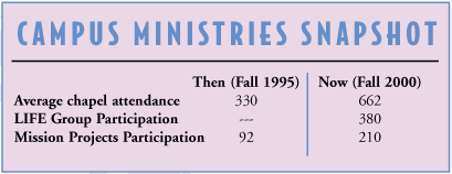 Union students are also taking active roles in the area of discipleship. Union students Kristen Wicker and Autumn Alcott had a vision for a young ladies ministry. It was out of their vision that Klemata was started. The student-initiated, student-lead Bible study that meets weekly involves a large number of young women on campus. “Autumn and I had a strong desire to start a ministry for young women on this campus,” explained Wicker. “The administration was so supportive and encouraged us to turn our vision into reality.” Discipleship, however, goes beyond Bible study. In 1997, a peer-mentoring program called LIFE Groups was started. The program places freshmen into small groups led by two upperclassmen. Each group focuses strongly on character development, success strategies, and adjustment to college life. Over 90 percent of freshman join a LIFE Group, which is a voluntary program. “The LIFE Groups have had a positive impact on the university, including retention,” says Brady. “Freshmen develop relationships from the beginning of the college experience. The support system established through the groups helps them to adjust to the challenges and opportunities of college life.” As with Life Groups, participation in other campus ministries has increased dramatically. The number of students involved in Global Opportunities (GO) trips has doubled over the last five years. The number of sites for the mission trips has also increased including international destinations such as Honduras, Costa Rico, Poland, Morocco, Spain, Israel and Egypt. “We are finding that students are hungry to be Christians and want to learn more,” says Brady. “As a university, we want to provide opportunities for our students to grow and learn to integrate their faith with every aspect of life.” |