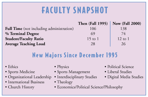 While faculty will always be supported and encouraged to be a teaching faculty first, scholarship is also being encouraged. The Center for Faculty Development provides numerous opportunities for faculty to attend lectures and increase their knowledge, thus enabling them to bring back information to their students. “Union has never been emphasized as a research institution,” says George Guthrie, department chair of Christian studies. “But we’re now being encouraged to facilitate the gifts that we have.” Guthrie points out that many of the professors in the Christian studies area are now publishing regularly, which he says is the reason for broader visibility that has brought the department from 110 majors in 1996 to 220 majors currently. “We’ve moved to a place where recognizable scholars are attracted to