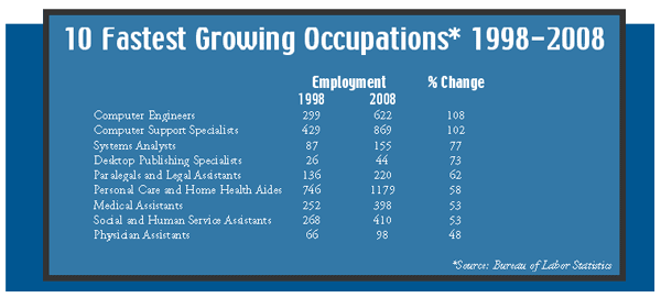 According to Jaqueline Taylor (‘99), Union’s assistant director of Career Services, technology has dramatically changed the shape of today’s workforce. “While these advances in technology have caused companies to scale back on people resources, other jobs are created as a result, and overall, a need for better trained, better educated employees has come about,” explains Taylor. “It’s enhanced the fact that we need people to be better trained in technical fields.” She cites higher education as an example. “We have a base of professors and instructors that are having to be more technologically savvy in order to keep the attention of the students that are coming into our colleges and universities,” says Taylor. Some fields have dramatically shifted due to technology. “We no longer have secretaries,” points out Taylor. “Now, we call them administrative or executive assistants and it’s because of that technology factor. They’re expected to know so much more now – they have to be able to teach or assist their supervisors in making presentations, using laptop computers and presentation software. They have to know what the technology does, how to troubleshoot it and how to use it more effectively.” “You don’t just ask for someone who can type 80 words-per-minute, but who can also handle databases, spread-sheet software and other technical ways of managing information,” says Taylor. While some jobs have been enhanced by technology, other vocations are significantly declining. Occupations such as farming, sewing machine operators, electrical assemblers, private household cleaners, office machine operators, service station attendants and bank tellers have experienced significant loss in numbers as a result of technological advances. Job-searching has also been affected by what you can, or can’t do with technology. According to Taylor, employers expect prospective job candidates to have the ability to get a resume to them instantly – whether by email or fax. And they expect an email address to be on that resume, says Taylor. She adds that there is a growing trend toward “video mail,” where employers can see what the person looks like. “I think it’s a good choice,” says Taylor, who compares it to a pre-interview, which allows an employer to see particular mannerisms, the candidate’s comfort level, and how polished he or she comes across. “It adds more of a personal feel.”