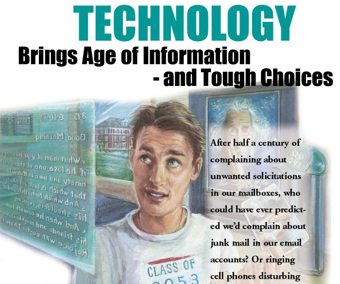 And it’s even worse at work. Now we have voicemail for when we’re on the other line, and email to con-tact our coworkers who are right down the hall, and the internet for research, research, research. It’s more than obvious – our technically advanced society is in a state of information overload. “There are certain inventions in history that have unquestionably altered the direction of civilization,” says Bill Truex (’68). "The printing press brought about the ability to disseminate information in a new way and to a larger audience than ever before. The computer is proving to be a tool of equal impact to information management, but along with this progress comes a new set of problems.” That problem is information overload, says Truex, who served as Union’s first computer center director for ten years before making the switch to Hewlett Packard. As a self-described functional manager at the company, he leads a “swat team” of technical gurus ready to help with a client’s emergency at a moment’s notice. “Every day we are faced with more data than we can use,” says Truex, and more decisions to make on what to do with the data – choosing which information we will use and what we will ignore. “Also, it’s not always easy to evaluate the quality of our information – whether it’s stock tips from a chat room or a medical decision based on some new but unproven procedure,” Truex points out. Advances in technology have affected all of us at some point. In business, it’s how efficiently we can now do our jobs, how accessible we can be to our clients and supervisors, and how fast we can complete a project. We now have to make decisions on how much technology we will allow around our family – whether it’s the new DVD player, or the open portal of the Internet. Health has also been affected by technology and we will have to make choices accordingly – do we want to know whether our unborn child has a genetic disposition toward a disease or are we willing to replace our decaying heart with a mechanical one? Even in our worship services, technology looms before us in the form of Power Point projected song lyrics and online Bible studies. “The computer offers us a vehicle to help solve the very problem [of information overload] that it has created,” adds Truex. “In the years to come, we will see the computer prove to be a tool that will over-come geographic boundaries, personal skill limitations, and help us make more sense of the knowledge around us.” |
