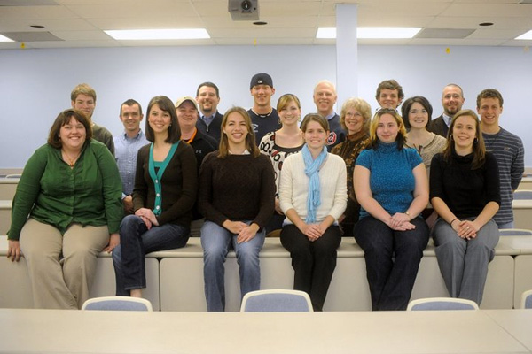 (front row, left to right) Kathleen Cooper, Katie Mohler, Mary Alisa Techentin, Kate Cline, Lauren Bogdan, and Elizabeth Blevins; (middle row, left to right) Charles Googe, Joshua Abbotoy (wearing light blue shirt), Cameron White, Katelyn O’Roark, Dr. Judy LeForge, Hannah Holliday, and Joel Wellum; (back row, left to right) Dr. Keith Bates, Carl Harken, Dr. Stephen Carls, Noah Arnold, and William Fortner.