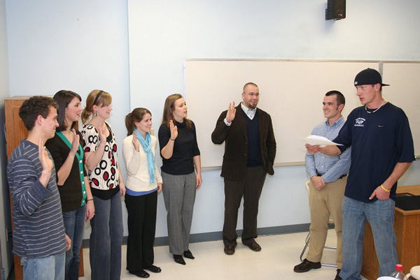 Chapter Vice President Carl Harken (right) leads the spring initiation ceremony while Delta-Psi President Joshua Abbotoy (second from right) looks on. New initiates are (left to right) Joel Wellum, Katie Mohler, Katelyn O’Roark, Kate Cline, Elizabeth Blevins, and William Fortner.