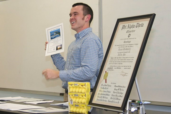 Feb 19, 2009 - The Delta-Psi Chapter of Phi Alpha Theta History Honor Society held its spring plenary meeting and initiation of new members on February 19, 2009. President Joshua Abbotoy presided over the meeting, which was attended by eighteen people. The chapter elected the following students as its officers for the 2009-2010 school year: Noah Arnold, president; Katelyn O’Roark, vice president; Mary Alisa Techentin, secretary; Lauren Bogdan and Joel Wellum, senators. Members also agreed to have a Carl Harken Day at the baseball field on a day when he pitches in April, to hold their annual Franco-American bake sale either on April 3 or April 19, and to have a Phi Alpha Theta tee shirt-wearing spirit day. President Abbotoy announced that the chapter’s seventeenth annual cookout will take place at Dr. Carls’s home on May 15, and that Phi Alpha Theta members are invited to attend the department’s May 5th awards banquet, which will celebrate the Rutledge Honorary History Club’s 80th anniversary. He also talked about the Phi Alpha Theta Biennial Convention in San Diego, California, on January 6-9, 2010, and, based on his own experience at the 2008 biennial convention in Albuquerque, New Mexico, he strongly encouraged students to attend the 2010 meeting.