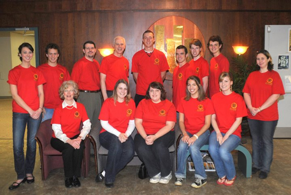 Delta-Psi Chapter members sporting their red Phi Alpha Theta T-shirts on March 16, 2009, include: (seated, left to right) Dr. Judy LeForge, Sarah Conway, Kathleen Cooper, Mary Alisa Techentin, and Katelyn O’Roark; (standing, left to right) Katie Mohler, Joel Wellum, Dr. Keith Bates, Dr. Stephen Carls, Carl Harken, Joshua Abbotoy, Charles Googe, Noah Arnold, and Lauren Bogdan.