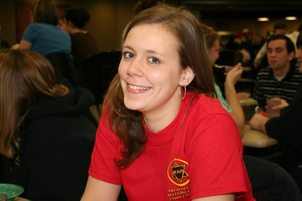 Elizabeth Blevins proudly wears her red T-shirt for Phi Alpha Theta in the Union cafeteria during lunch on March 16.