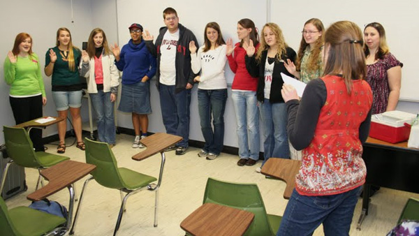 Club President Elizabeth Blevins (with back to camera) conducts the initiation ceremony for the Rutledge Honorary History Club on October 26. Initiates are: (left to right) Caraline Rickard, Madeline Sparks, Mary Ellen Poe, Glenae Nora, Will Miller, Steffi King, Savannah German, Jessica Duck, Patricia Dawson, and Lauren Bogdan.