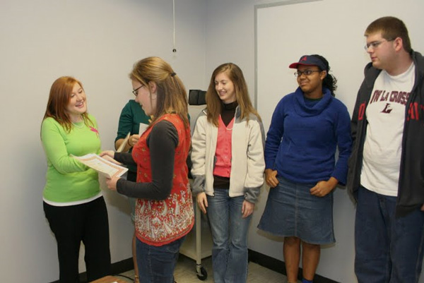 Rutledge Honorary History Club President Elizabeth Blevins presents Caraline Rickard with her certificate of membership on October 26. Watching with great interest are (center, going to the right) Mary Ellen Poe, Glenae Nora, and Will Miller.