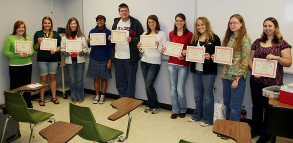 Newly initiated members of the Rutledge Honorary History Club proudly hold their certificates of membership. They are: (left to right) Caraline Rickard, Madeline Sparks, Mary Ellen Poe, Glenae Nora, Will Miller, Steffi King, Savannah German, Jessica Duck, Patricia Dawson, and Lauren Bogdan.