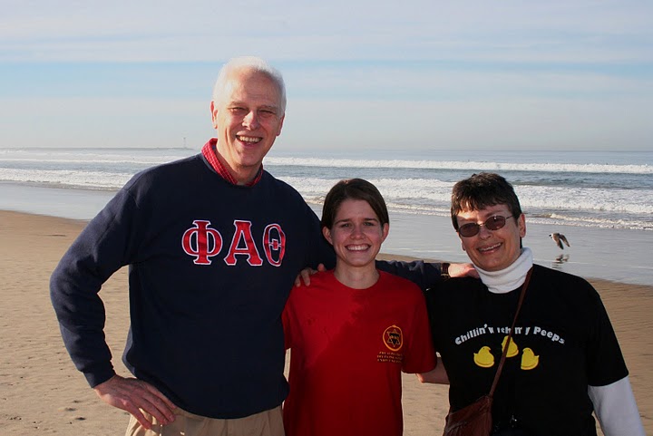 Dr. Stephen Carls, Kate Cline (center), and Dr. Alice-Catherine Carls take a break from their activities along the Pacific Ocean at Mission Bay on January 9.