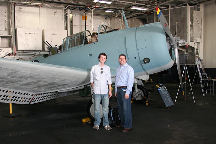 Noah Arnold and Dr. Keith Bates stand in front of an SBD Dauntless dive bomber while visiting the USS Midway Museum on January 9.