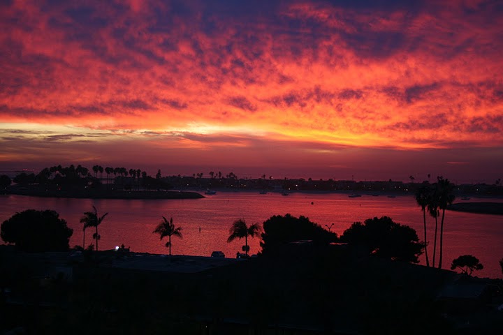 A striking sunset fills the sky over Mission Bay in San Diego on January 9, 2010.