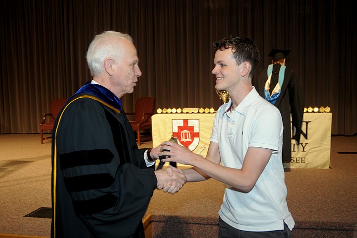 Graduating history major Noah Arnold accepts the academic excellence medal in history from Dr. Stephen Carls at the Union University Annual Awards Day Convocation on May 7.