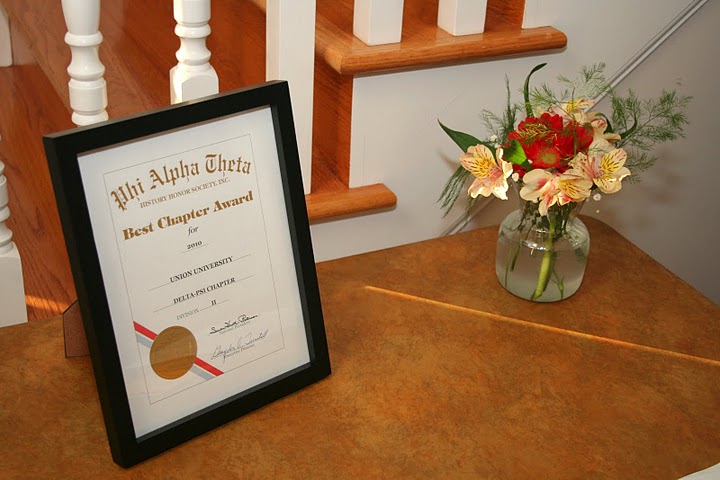 Oct 22, 2010 - Union’s Delta-Psi Chapter of Phi Alpha Theta History Honor Society celebrated its 2010 Best Chapter Award with a homemade pizza party at the home of Dr. Stephen Carls on October 22. Twenty-four people attended the event; among them was last year’s Delta-Psi president, Noah Arnold, who drove up from the University of Mississippi, where he is currently pursuing a Master of Arts in history. The dinner menu included homemade pizza, a tossed salad, ratatouille, and homemade apple dumplings. Dr. Carls announced during a brief program that Union’s library had ordered eleven history books recommended for purchase by Delta-Psi members with the $250 Best Chapter Award prize money. The 2010 Best Chapter Award certificate was on prominent display for the event, as were decorations that celebrated the chapter’s success.