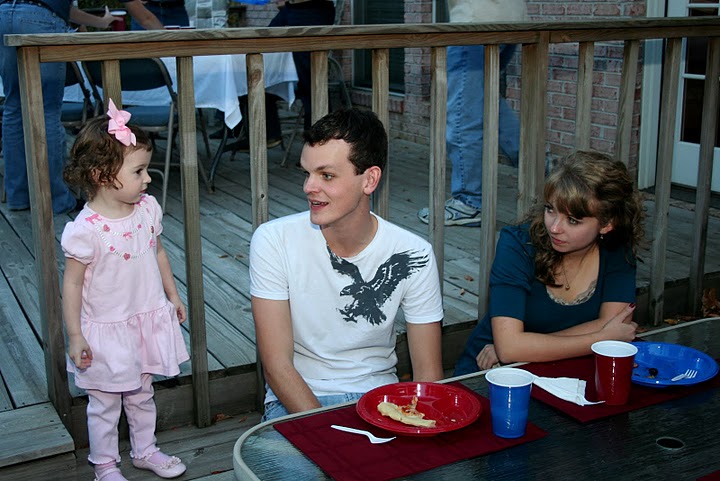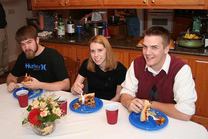 Travis Lutz, Karie Webster, and David Conway eat pizza together at Dr. Carls’s home on October 22.
