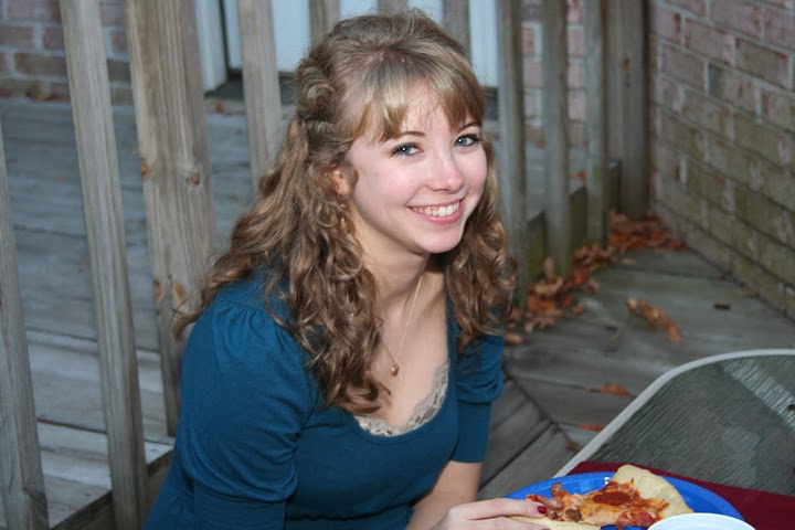 Delta-Psi member Mary Ellen Poe expresses joy as she selects her food items at the October 22nd Phi Alpha Theta pizza party.
