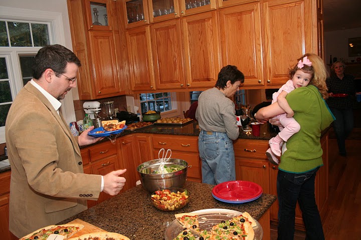 Dr. Keith Bates prepares his dinner plate while his wife Lisa, holding their daughter Rachel, talks with Dr. Alice-Catherine Carls at the Phi Alpha Theta pizza party.