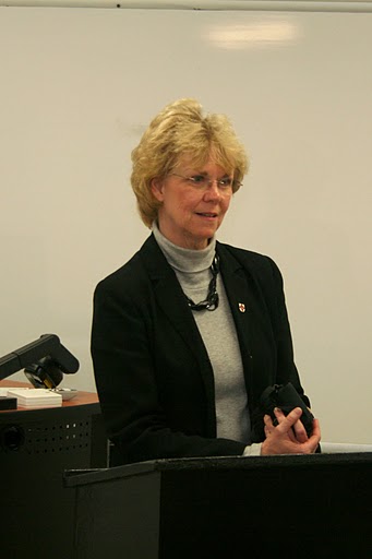 Dr. Judy LeForge, the history department’s education liaison, introduces Mr. Jared Myracle, the assistant principal at Medina Middle School, as the program speaker on November 8, 2010.