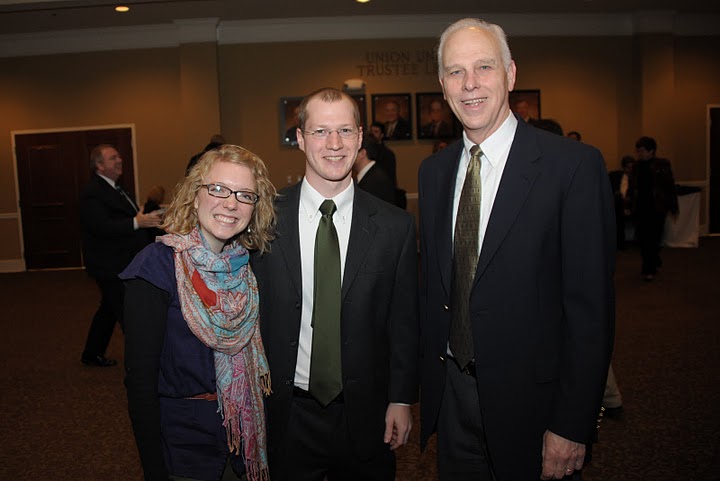 Dr. Stephen Carls (left) stands with graduating history major Mike Evans and his wife Jewel at the Union University-sponsored brunch prior to graduation on December 11, 2010.