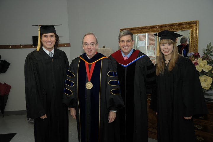 Dr. David Dockery (second from left) stands with Student Government Association President Micah Roeder (left), Azusa Pacific University President Jon Wallace (second from right), and Senior Class President Betsy Davis just prior to Union’s fall commencement exercises on December 11, 2010.