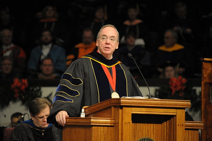 Dr. Jon Wallace, President of Azusa Pacific University, delivers his commencement address on “Who am I? What is my purpose? What difference does it make?” to a large crowd at Union’s fall graduation on December 11.