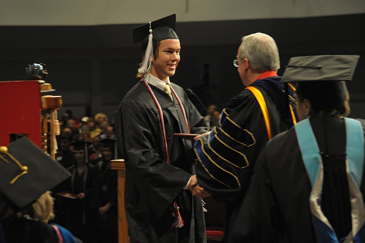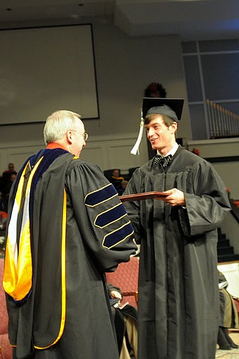 History major Jordan Thompson receives a diploma and congratulations from Dr. David Dockery at Union’s commencement exercises on December 11, 2010.
