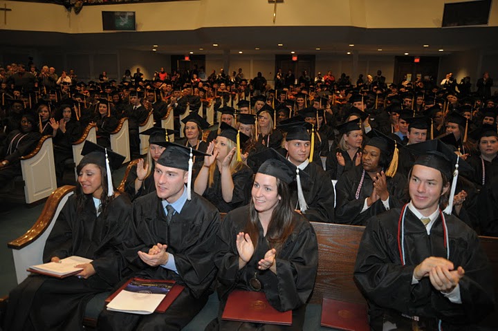 Graduating students express their appreciation to the Union University faculty for providing them with the educational tools needed to move forward with their lives. Among those applauding are history majors Daniel Ramer (front row, second from left), Joshua Sinquefield (second row, third from left), and Jordan Thompson (front row, right).
