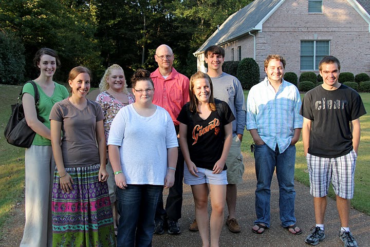 The first arrivals at the history department's welcome reception on September 12, 2011, stand together in front of Dr. Carls's home. They are: (left to right) Megan Winters, Hannah Marsh, Christy Fowler, Shelby Pace, James Fowler, Terilyn Wassell, Charles Snow, Matt Moore, and Colton Gebben.
