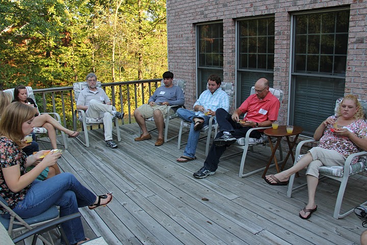 Guests at the history welcome reception enjoy food, conversation, and beautiful weather on the deck of Dr. Carls's home on September 12, 2011. Those who are visible are (starting on the left, going clockwise) Heather Stricklin, Terilyn Wassell, Dr. Terry Lindley, Charles Snow, Matt Moore, James Fowler, and Christy Fowler.