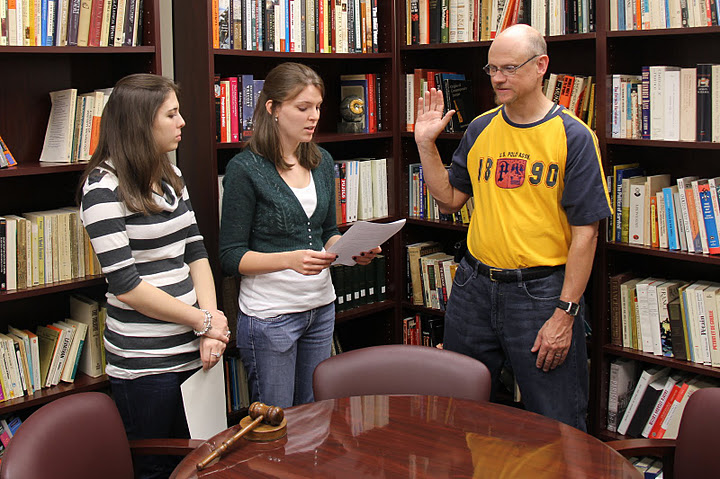 Delta-Psi Chapter Vice President (second from left) conducts the induction ceremony for new member James Fowler (right) on November 15, 2011. Phi Alpha Theta President Caitlin Roach waits to give him his certificate of membership.