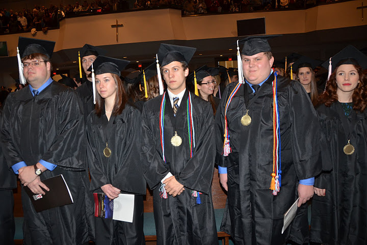 History minor Joel Wellum (third from left) and history major Samuel Wiggin (second from right), both Phi Alpha Theta members, stand as the processional concludes at Union's graduation exercises on December 10, 2011 at West Jackson Baptist Church. Photo by Morris Abernathy.