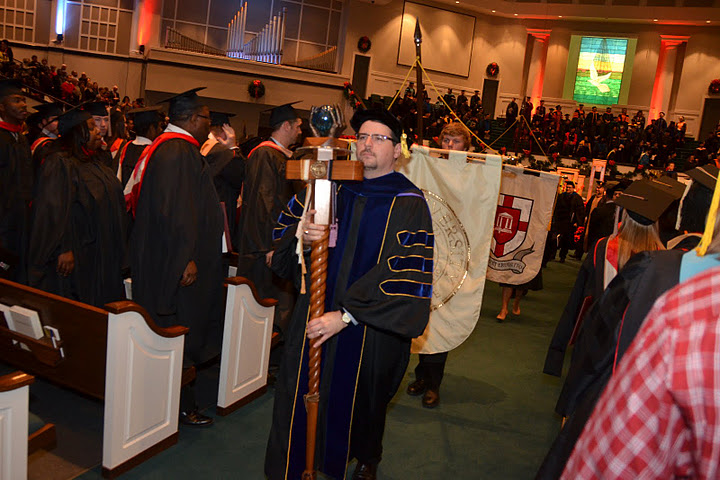 Faculty Member of the Year Dr. Keith Bates, carrying the Union University mace, leads the recessional at the graduation services on December 10, 2011, at West Jackson Baptist Church. Photo by Morris Abernathy.