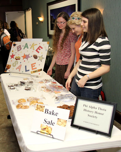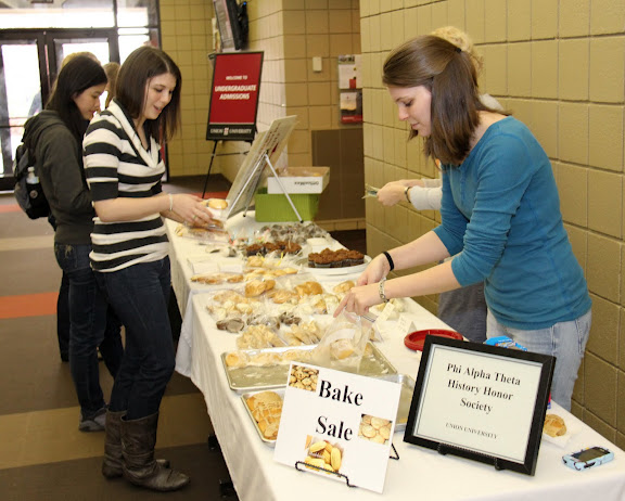 Union’s Delta-Psi Chapter of Phi Alpha Theta History Honor Society held its Eighth Annual Franco-American Confection and Bake Sale on March 7, 2012. Several Phi Alpha Theta members provided an array of baked goods and candies, including Snickerdoodles, peanut butter fudge, toffee, sugar cookies, Oreo balls, chocolate cupcakes, and brownies. The French items, prepared by Dr. Alice-Catherine Carls, consisted of croissants, truffles, dark chocolate mini cakes, and Madeleine tea cakes. Dr. Carls also prepared cinnamon rolls and almond-cranberry-pistachio biscotti. Seven Delta-Psi members, led by Chapter President Caitlin Roach and Vice President Savannah German, worked at the sale tables at one point or another.