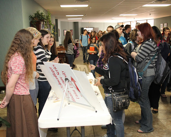 Three Phi Alpha Theta members wait on customers at the Delta-Psi Chapter's bake sale in Union's chapel foyer on March 7, 2012. They are (left to right) Patricia Dawson (wearing brown skirt), Elaura Highfield, and Caitlin Roach.