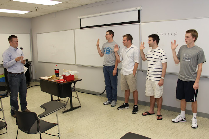 Rutledge Honorary History Club President David Conway administers the membership oath to inductees Cory Cronin (left to right), Colton Gebben, Kenan Keller, and Aubrey Binkley at the club's spring initiation on April 3, 2012.