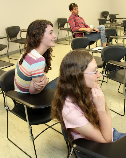 Rutledge Honorary History Club members Megan Winters (front left), Patricia Dawson (front right), and Logan Smith (behind) watch the club's initiation ceremony on April 3, 2012.
