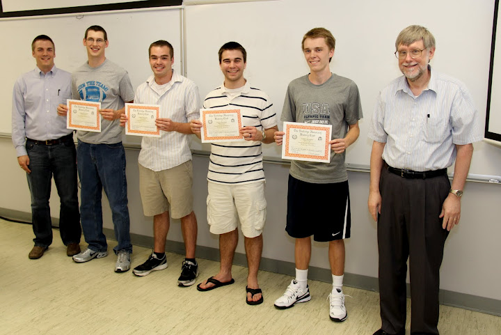 The Rutledge Honorary History Club inducted four new members at its spring initiation on April 3, 2012. Club president David Conway conducted the ceremony at which Aubrey Binkley, Cory Cronin, Colton Gebben, and Kenan Keller became members. Dr. Terry Lindley, the club’s faculty advisor, used the occasion to talk briefly about the club-sponsored Department of History Awards Banquet on May 3. Refreshments were served at the meeting.